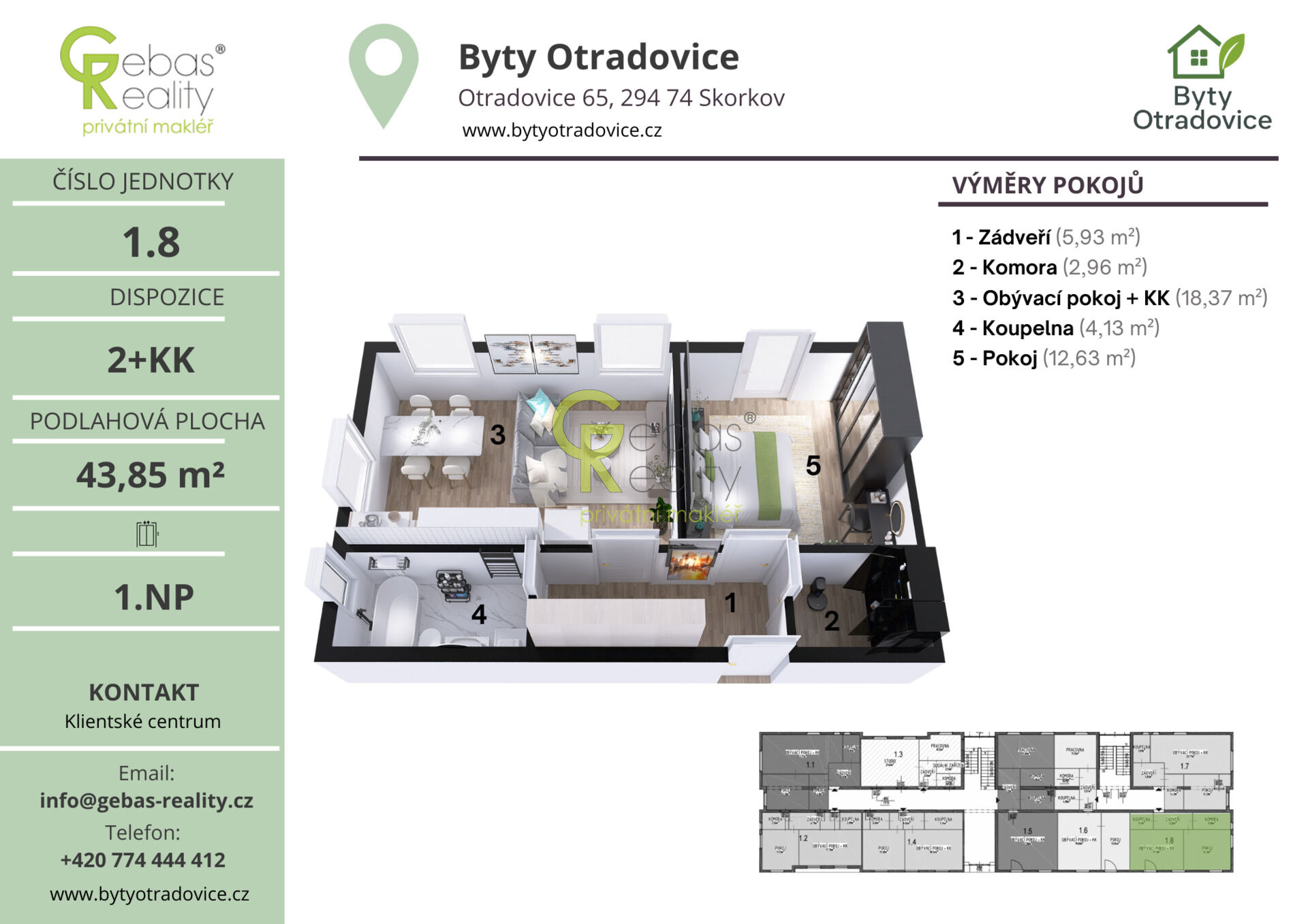 Ve výhradním zastoupení si Vás dovolujeme oslovit nabídkou moderní bytové jednotky o dispozici 2+KK a celkové užitné ploše 45,6 m², která se nachází v kompletně zrekonstruovaném bytovém domě v obci Otradovice – Skorkov pouhých 5 minut od Brandýsa nad Labem – Staré Boleslavi. Projekt Byty Otradovice zahrnuje celkem 16 bytových jednotek různých velikostí a nabízí kvalitní a komfortní bydlení v klidné lokalitě s výbornou dostupností do Prahy, Brandýsa nad Labem – Staré Boleslavi i Mladé Boleslavi. Součástí kupní ceny je parkovací stání před domem, kuchyňská linka vyrobená na míru od truhláře včetně vestavných spotřebičů, kompletní sanita v koupelně značky JIKA a zděný sklep o minimální ploše 15 m² umístěný v suterénu domu.