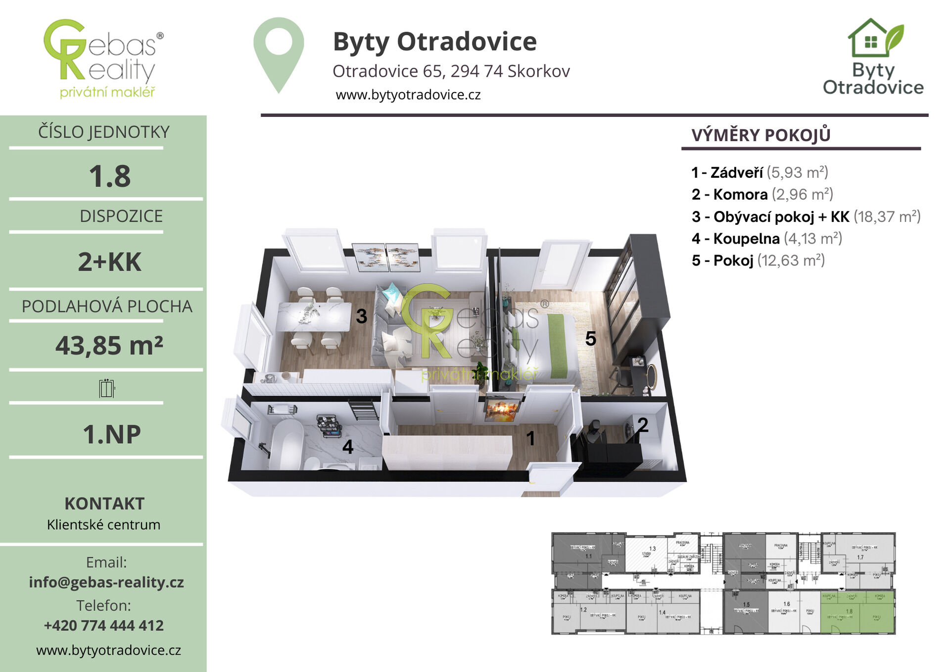 Ve výhradním zastoupení si Vás dovolujeme oslovit nabídkou moderní bytové jednotky o dispozici 2+KK a celkové užitné ploše 43,9 m², která se nachází v kompletně zrekonstruovaném bytovém domě v obci Otradovice – Skorkov pouhých 5 minut od Brandýsa nad Labem – Staré Boleslavi. Projekt Byty Otradovice zahrnuje celkem 16 bytových jednotek různých velikostí a nabízí kvalitní a komfortní bydlení v klidné lokalitě s výbornou dostupností do Prahy, Brandýsa nad Labem – Staré Boleslavi i Mladé Boleslavi. Součástí kupní ceny je parkovací stání před domem, kuchyňská linka vyrobená na míru od truhláře včetně vestavných spotřebičů, kompletní sanita v koupelně značky JIKA a zděný sklep o minimální ploše 15 m² umístěný v suterénu domu.