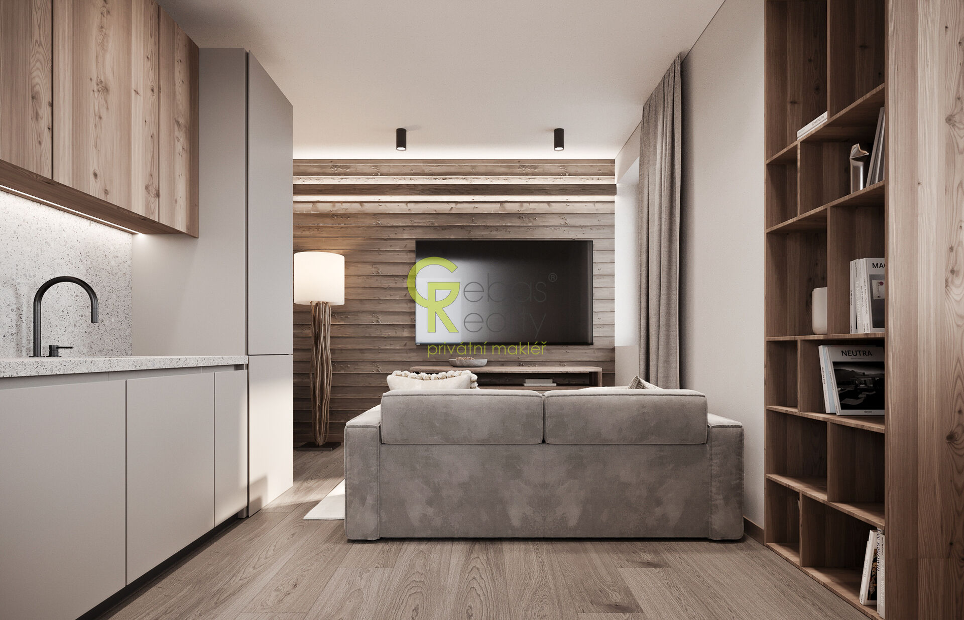 Kuchyňská linka na míru od truhláře včetně spotřebičů. Podlahy bytu - keramická dlažba + vinyl. Kompletní sanita včetně skleněného sprchového koutu. Podlahové vytápění. Elektrická nabíječka na vozidla. FTV panely + tepelné čerpadlo.