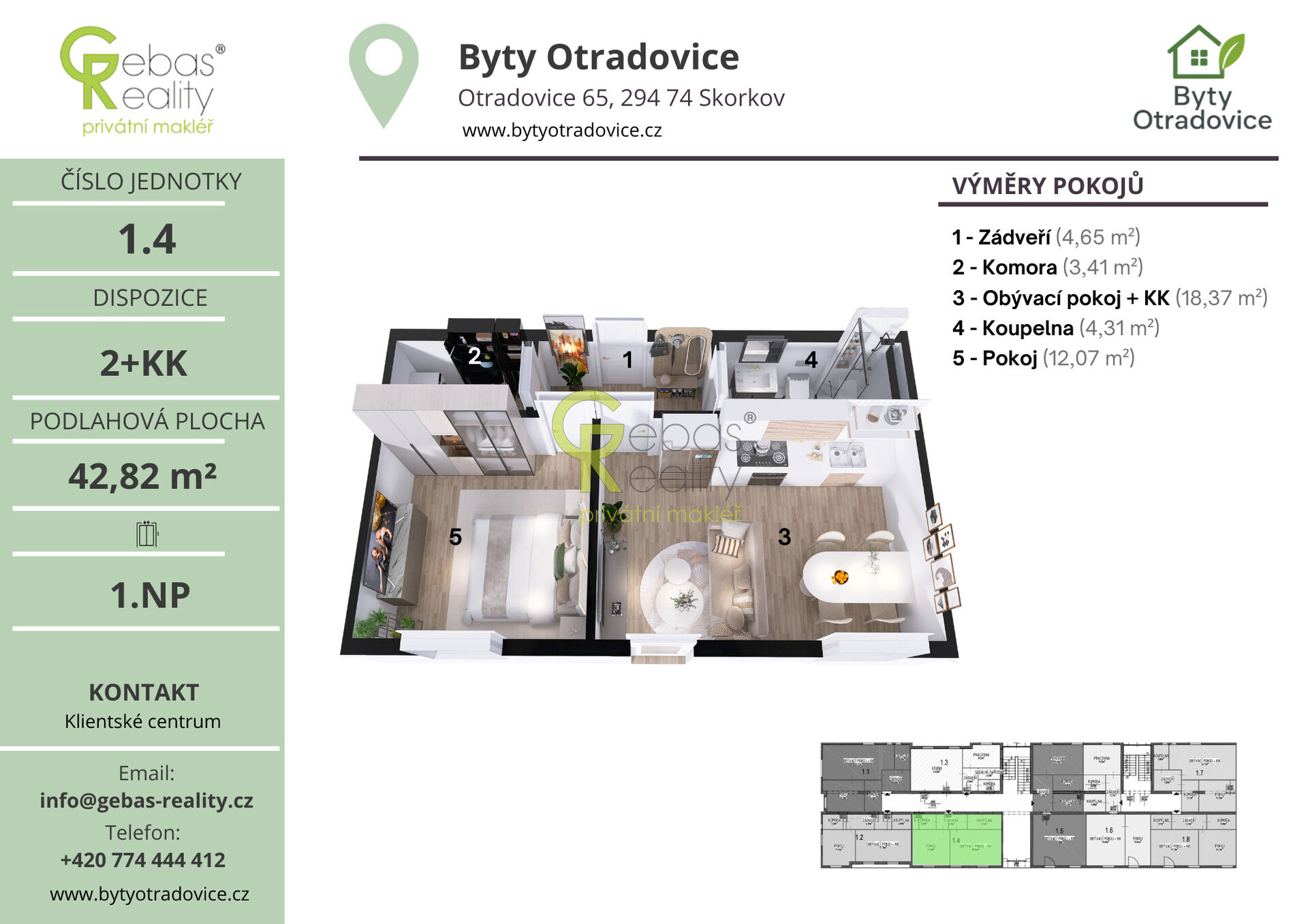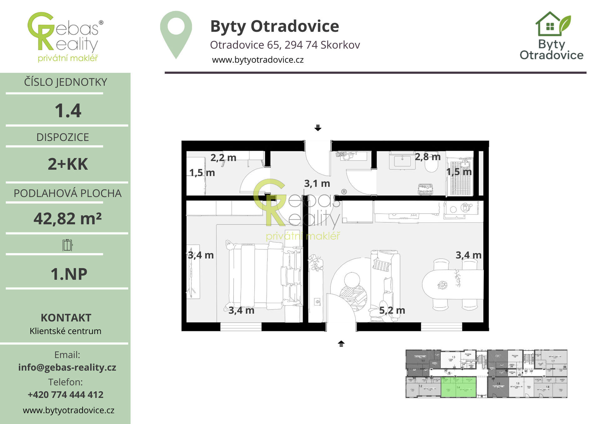Ve výhradním zastoupení si Vás dovolujeme oslovit nabídkou moderní bytové jednotky o dispozici 2+KK a celkové užitné ploše 42,8 m², která se nachází v kompletně zrekonstruovaném bytovém domě v obci Otradovice – Skorkov pouhých 5 minut od Brandýsa nad Labem – Staré Boleslavi. Projekt Byty Otradovice zahrnuje celkem 16 bytových jednotek různých velikostí a nabízí kvalitní a komfortní bydlení v klidné lokalitě s výbornou dostupností do Prahy, Brandýsa nad Labem – Staré Boleslavi i Mladé Boleslavi. Součástí kupní ceny je parkovací stání před domem, kuchyňská linka vyrobená na míru od truhláře včetně vestavných spotřebičů, kompletní sanita v koupelně značky JIKA a zděný sklep o minimální ploše 15 m² umístěný v suterénu domu.
