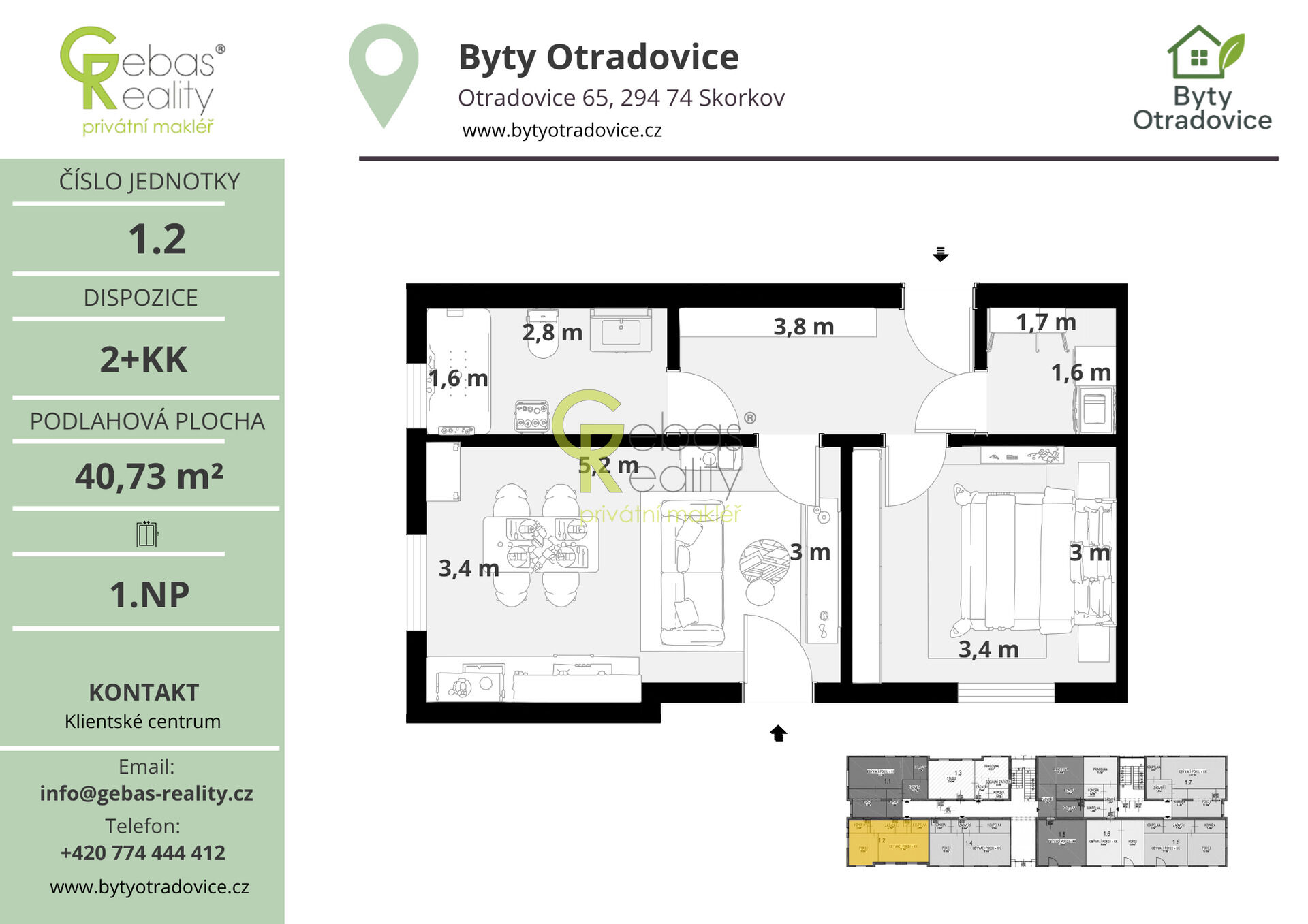Ve výhradním zastoupení si Vás dovolujeme oslovit nabídkou moderní bytové jednotky o dispozici 2+KK a celkové užitné ploše 42,6 m², která se nachází v kompletně zrekonstruovaném bytovém domě v obci Otradovice – Skorkov pouhých 5 minut od Brandýsa nad Labem – Staré Boleslavi. Projekt Byty Otradovice zahrnuje celkem 16 bytových jednotek různých velikostí a nabízí kvalitní a komfortní bydlení v klidné lokalitě s výbornou dostupností do Prahy, Brandýsa nad Labem – Staré Boleslavi i Mladé Boleslavi. Součástí kupní ceny je parkovací stání před domem, kuchyňská linka vyrobená na míru od truhláře včetně vestavných spotřebičů, kompletní sanita v koupelně značky JIKA a zděný sklep o minimální ploše 15 m² umístěný v suterénu domu.