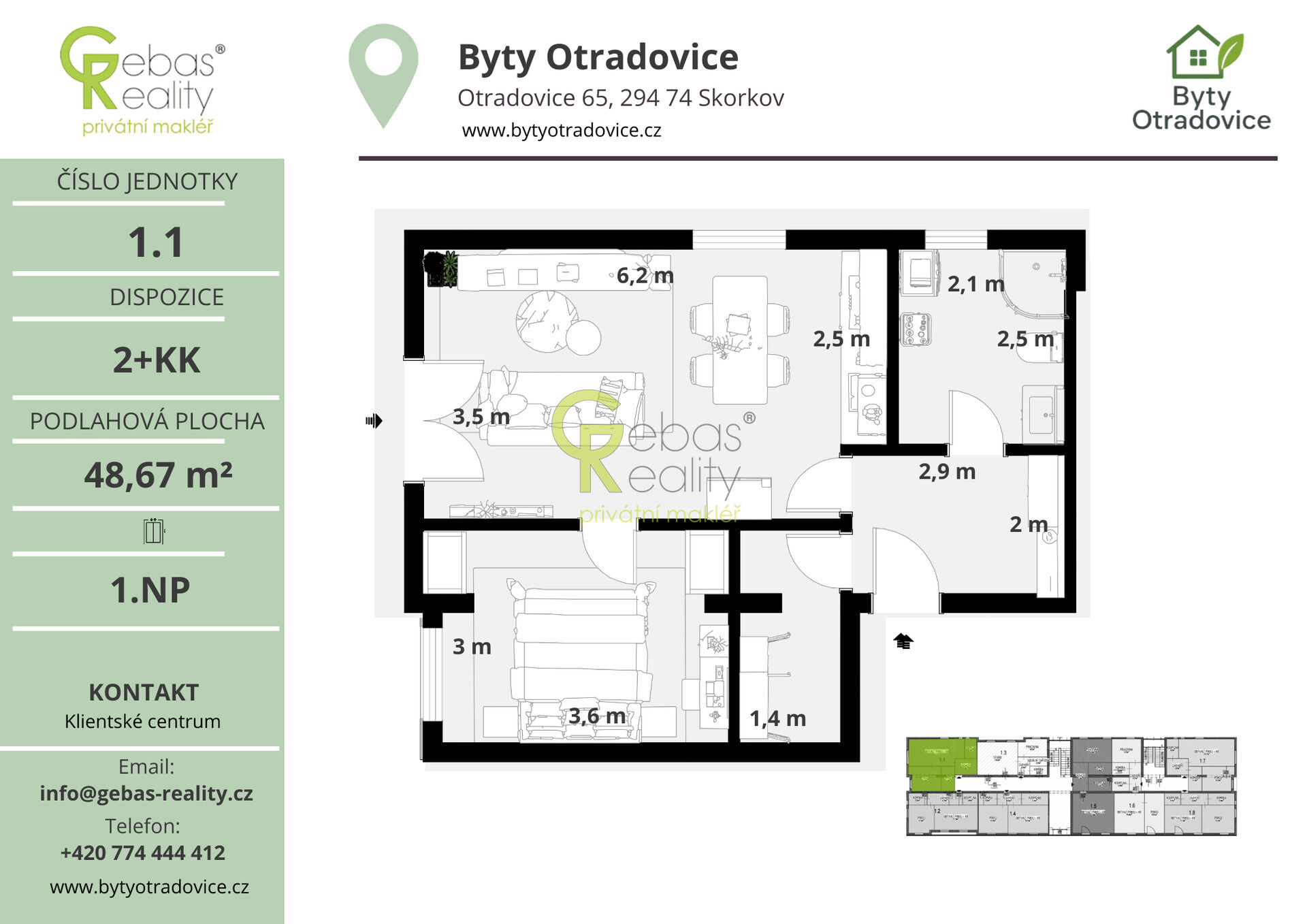 Ve výhradním zastoupení si Vás dovolujeme oslovit nabídkou moderní bytové jednotky o dispozici 2+KK a celkové užitné ploše 51,1m², která se nachází v kompletně zrekonstruovaném bytovém domě v obci Otradovice – Skorkov pouhých 5 minut od Brandýsa nad Labem – Staré Boleslavi. Projekt Byty Otradovice zahrnuje celkem 16 bytových jednotek různých velikostí a nabízí kvalitní a komfortní bydlení v klidné lokalitě s výbornou dostupností do Prahy, Brandýsa nad Labem – Staré Boleslavi i Mladé Boleslavi. Součástí kupní ceny je parkovací stání před domem, kuchyňská linka vyrobená na míru od truhláře včetně vestavných spotřebičů, kompletní sanita v koupelně značky JIKA a zděný sklep o minimální ploše 15 m² umístěný v suterénu domu.
