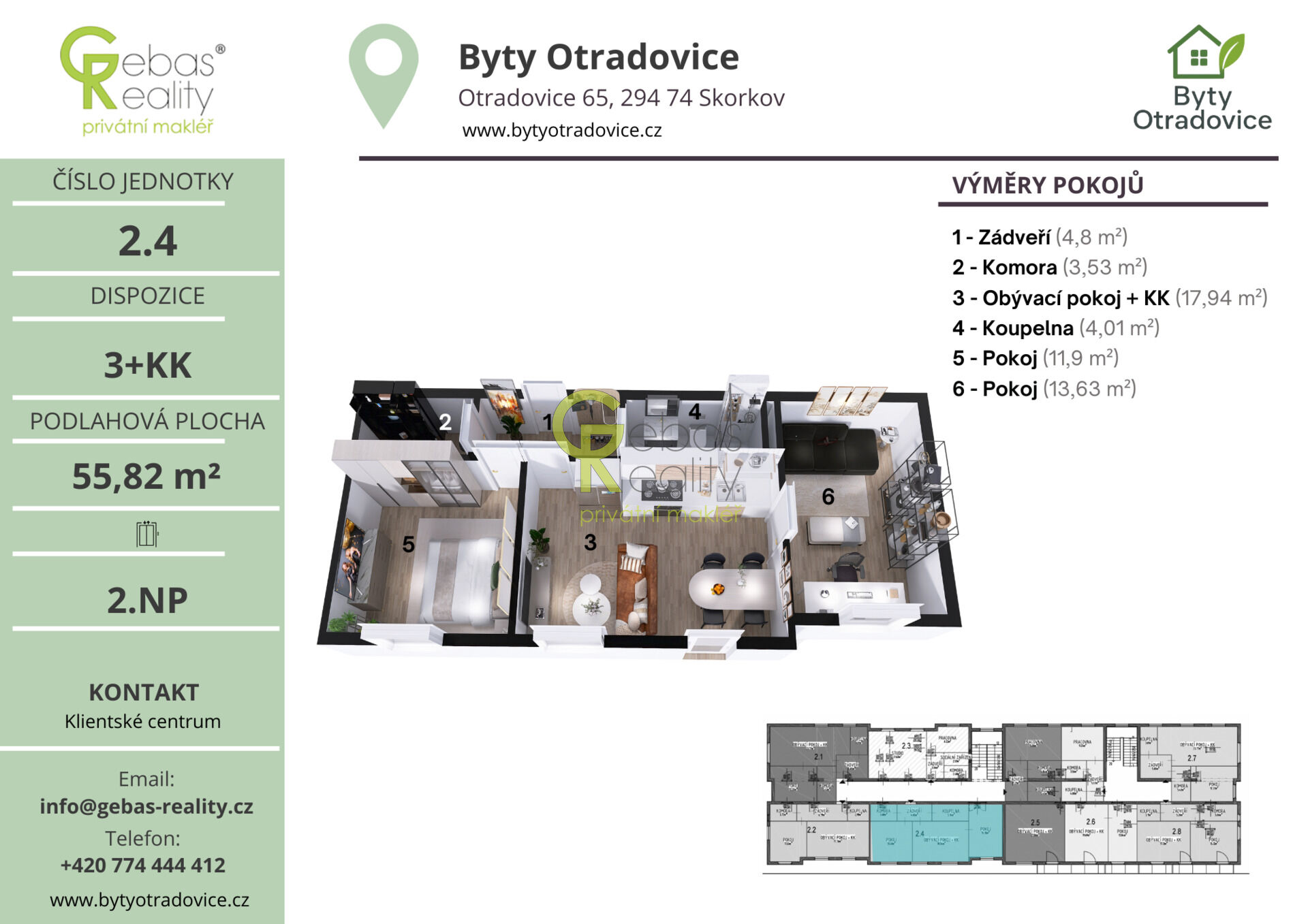 Ve výhradním zastoupení si Vás dovolujeme oslovit nabídkou moderní bytové jednotky o dispozici 3+KK a celkové užitné ploše 58,7m², která se nachází v kompletně zrekonstruovaném bytovém domě v obci Otradovice – Skorkov pouhých 5 minut od Brandýsa nad Labem – Staré Boleslavi. Projekt Byty Otradovice zahrnuje celkem 16 bytových jednotek různých velikostí a nabízí kvalitní a komfortní bydlení v klidné lokalitě s výbornou dostupností do Prahy, Brandýsa nad Labem – Staré Boleslavi i Mladé Boleslavi. Součástí kupní ceny je parkovací stání před domem, kuchyňská linka vyrobená na míru od truhláře včetně vestavných spotřebičů, kompletní sanita v koupelně značky JIKA a zděný sklep o minimální ploše 15 m² umístěný v suterénu domu.